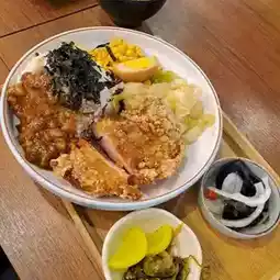 The chicken chop is large, with a crispy and tender texture. The braised pork is cooked to a smooth consistency, making it perfect for mixing with rice. The addition of pickled radish adds a rich texture.