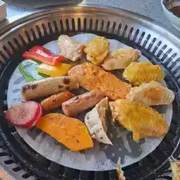 The BBQ offers a wide selection of meats, some marinated, including beef, pork, chicken, seafood, and sausages. The chicken wings are large and meaty, and the pork belly and ribs are very succulent. There are also various vegetables like zucchini, eggplant, bell peppers, and pumpkin, as well as sweet and juicy pineapple slices. The ingredients are quite abundant.