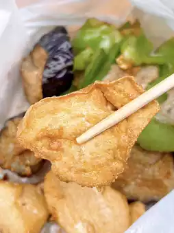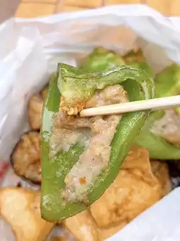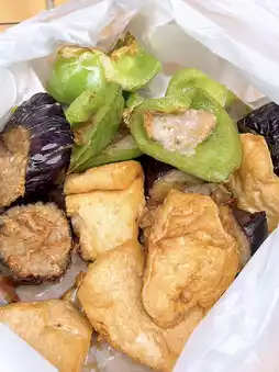 The fried three treasures have three kinds of eggplant, tofu, green pepper, no choice, directly order a portion of 15 pieces is this portion, the fried three treasures is obviously back fried, eggplant is warm, green pepper is very hot, tofu even hotter, The fish meat has no taste, plus the portion is small, basically not very tasty, tofu is straight no fish meat 😂
