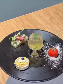 The shopkeeper suggested drinking Welcome Drink first and then eat the lighter cheese tart > honeydew jelly > goose liver mousse First Welcome Drink Sage green wine vinegar soda drink very Fresh very fresh green flavor πΈ Cheese tart is black truffle flavor taste quite rich with roasted sweet corn and quail egg The jelly-inside honeydew pieces are refreshing with ham salty unexpectedly go well! Finally, eat the more rich flavor of goose liver mousse eat savory full of savory mousse smooth middle rum cherry quite heavy alcohol flavor can neutralize the greasiness of goose liver π₯°