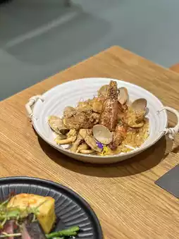 Seafood rice is lobster sauce sauce very plentiful rice can be dipped in sauce eat very creamy inside wild tiger shrimp, bacon, squid and mussels are quite fresh bacon cooked not tough eat quite bouncy mussels no sand It goes well with mayonnaise. There is also a bacon cheese tortilla with the meal. It tastes a little like tamagoyaki and has a soft texture
