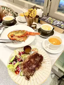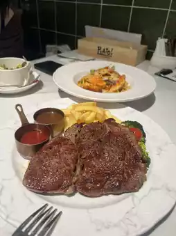His steak ordered 50%, fried just right crispy outside and soft inside, and the inside is not too cooked bite down very soft, and juicy beef flavor and strong 👍🏻 great. And his beef barbecue sauce will not be too grab the beef flavor after ordering, plus grapefruit juice salad vegetables and fries are very full, enough portion. And the BBQ sauce chicken wings are really good the sauce, very appetizing plus fried to crispy chicken wings mixed together really good! And with a cup of sweet fruit tea really thirst-quenching.