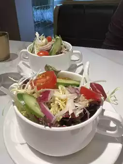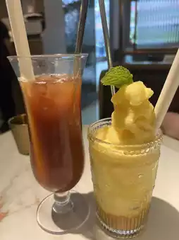 His pasta used tomato sauce plus toasted tender chicken breast, and some mushrooms and asparagus, sour and sweet and appetizing. And the after-meal dessert heart tart eat very melty, chocolate flavor is strong enough. It's great with ice cream and ice and fire. Finally, I drank a cup of sweet mango shake to relieve my hunger. I was very satisfied and full 👍🏻 The restaurant served with a salad that was sweet and sour and delicious🤤