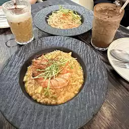 Very bouncy noodles, can eat crab meat and mint 😬 plus a very creamy and rich sauce, salty and fragrant, the taste is very rich 🤗 Hot cream soup taste smooth, good to drink 😍 Chocolate coffee, coffee taste very rich, sweet and smooth!