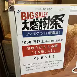 If you spend over 1000 yen, you can get a kinako warabimochi (¥700) for free!