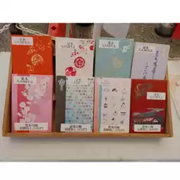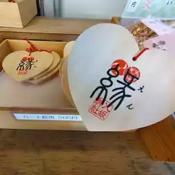 At the shrine office, there are heart-shaped votive plaques and fortune-telling slips.
