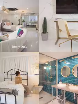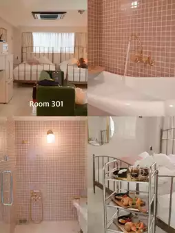 There are rooms surrounded by marble patterns, pink bathrooms, and rooms with two queen beds and two 3-4 seater sofas.