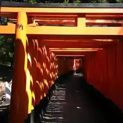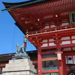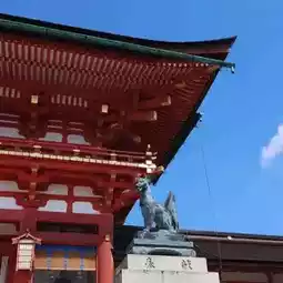 As soon as I got off the station, a really, really cute fox statue greeted me. I was able to arrive at the shrine in about 10 minutes on foot. There was a Japanese-style railway nearby. There were also street stalls in front of the shrine, and there were lots of souvenirs and food on the way. There was no admission fee, and as you pass the shrine with the fox statues, you can see a place to buy amulets, and if you go a little further, you can see a really long torii. #KyotoTravel #FushimiInariShrine #FoxShrine #JapanTravel
