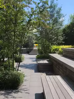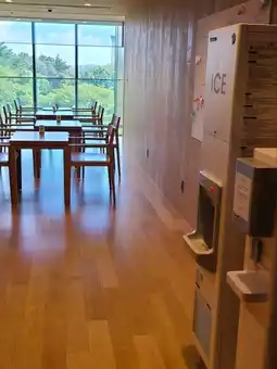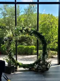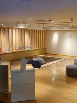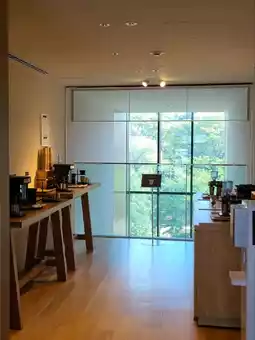 The entrance has large windows with a view of greenery, giving it a very open and relaxing feel.