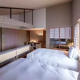 Each of the 40 guest rooms has an indoor bath where you can enjoy the soft hot spring water. The rooms are decorated with seasonal flower crowns. You can feel the four seasons of mysterious Kyoto in this luxurious building. Dinner is served at the hotel's lhoto, and charcoal-grilled dishes using Kyoto seasonal ingredients and Kyoto vegetables, as well as modern dishes inspired by Japanese gardens, and wine and sake can be tasted.