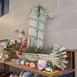 The rake-shaped treasure ship was decorated with colorful Seven Lucky Gods, Daruma, Maneki Neko, Okame, and other auspicious items such as Fukusuke and Mt. Fuji, and it was very cute.