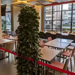 There is a buffet-style restaurant at the front of the same first floor, surrounded by lots of greenery and bright glass windows, with plates of various dishes lined up.
