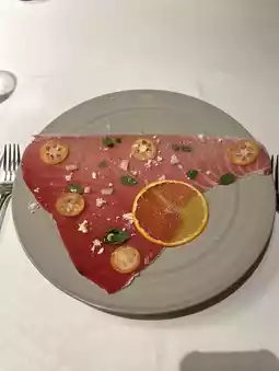 Bluefin tuna with kumquat, pecorino romano and olive oil powder
