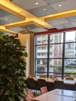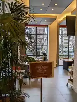The buffet-style restaurant has a lot of greenery, and the sunlight coming in through the large windows makes the restaurant bright and open.