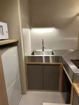 There is a compact sink with an IC heater, a refrigerator and a microwave ✨
