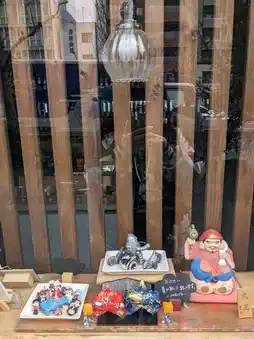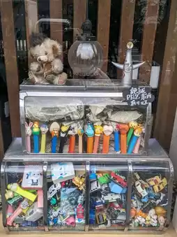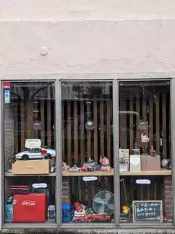 The large number of miniature cars displayed in the window and antique miscellaneous goods are colorful and cute.
