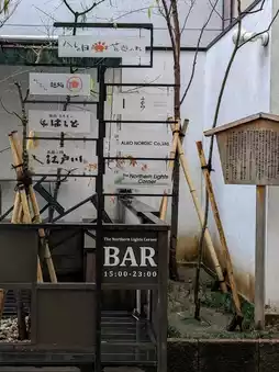 You can feel the atmosphere of nature, such as a temple for warding off evil, a Japanese-style bar lined with stylish signs, bamboo, trees, and more.