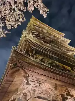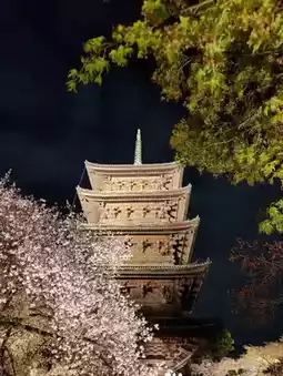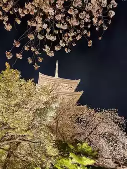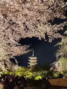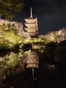 To-ji Temple, officially known as Kyoo-gokoku-ji Temple, is a historic temple located in Kyoto, Japan. Every spring, the cherry blossoms around Toji Temple are in full bloom, attracting many tourists to come and enjoy the flowers. At night, the temple and cherry blossoms are illuminated, creating a quiet and mysterious atmosphere, making people feel as if they are in a moving painting.