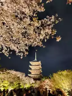 When you visit Toji Temple at night, you can see the silhouette of the five-story pagoda against the night sky, which looks particularly magnificent. Under the cherry trees, the lights and petals complement each other, and each cherry blossom looks as if it is carefully embellished with light, which is beautiful beyond words. Walking here, you can not only feel the vitality of spring, but also experience the tranquility and solemnity of the temple at night.