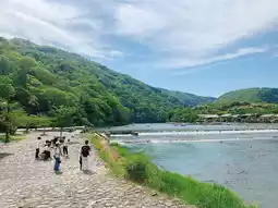 Togetsukyo Bridge is a bridge over the Katsura River that flows between Sagano and Arashiyama, and it was very pleasant to relax by the river and feel like we were in Kyoto.