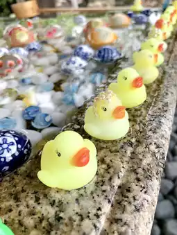 The cute ducks and colorful flower balls