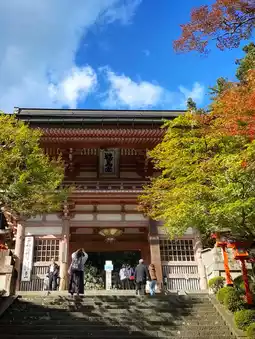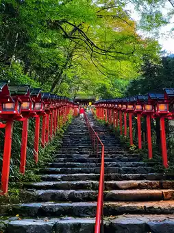 Within Kurama Temple, there are monuments inscribed with poems by the famous Japanese poets Tekkan Yosano and Akiko Yosano. Passing through the majestic Niomon Gate and along the winding mountain path of about 1 kilometer to the main hall, visitors can enjoy the beautiful natural scenery surrounding Kurama Temple. The dreamlike crimson Yaezakura cherry blossoms in spring and the panoramic view of the mountainside ablaze with red leaves in autumn are considered the temple's most spectacular sights.