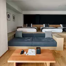 As soon as you enter the hotel, you can see the unique check-in book wall, which has more than ๐ฎ๐ฑ๐ฌ๐ฌ books on Kyoto. At night, it is transformed into a micro cinema with a projector.