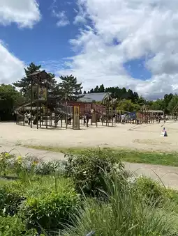 With a 13-hectare site that includes a railway museum, an aquarium, a hotel, a Japanese garden, playground equipment for children, a tram square, flower beds, and a spacious lawn, this park is a collection of attractions. It was sparsely populated in the morning, but by late morning, it was bustling with tourists, school excursions, and local residents taking walks. It seems to have been created with the purpose of establishing a large-scale green hub in the green-scarce city center of Kyoto and serving as a wide-area evacuation site in case of disasters. It is a recommended spot for sightseeing in Kyoto.