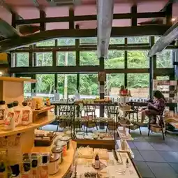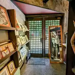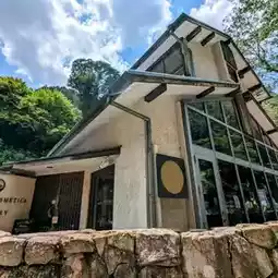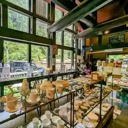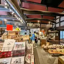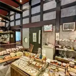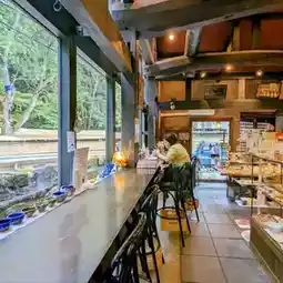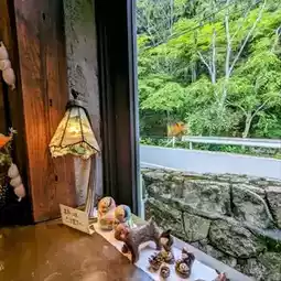 Kifune Cosmetic & Gallary is a handmade product store that also serves as an art gallery and coffee shop. It has a large beautiful floor-to-ceiling window, from which you can see the green mountains of Kibune, as well as the travelers passing by on the bus. Can you vaguely see someone drinking coffee?