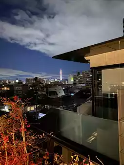 The room is not large but highly efficient, with shoes to be removed right at the entrance, and wooden clogs on the balcony. The L-shaped balcony offers a view of the Kamo River on one side and the residential area around Gojo on the other. The hotel is exquisite, and its biggest selling point might be the view from the top-floor observation deck, which should be very nice in spring, summer, and autumn. In winter, because it's near the river, it feels a bit cold.