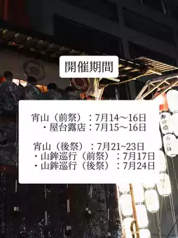 ⏳Dates and timesYoiyama (first festival)... July 14th-16th・Food stalls... July 15th-16thYoiyama (second festival)... July 21st-23rd・Yamahoko procession (first festival)... July 17th・Yamahoko procession (second festival)... July 24th