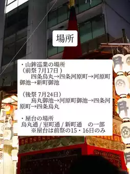 🗺Location・Location of Yamahoko procession (first festival July 17th) Shijo Karasuma → Shijo Kawaramachi → Kawaramachi Oike → Shinmachi Oike (second festival July 24th) Karasuma Oike → Kawaramachi Oike → Shijo Kawaramachi → Shijo Karasuma・Location of food stalls Karasuma-dori / Muromachi-dori / Part of Shinmachi-dori *Food stalls are only available on the 15th and 16th of the first festival
