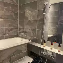 There is no bathtub, but the shared facilities have a bathtub, kitchen, refrigerator, and coin laundry, so it seems quite comfortable for long-term stays!
