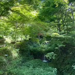 There is a small red bridge and a stream inside