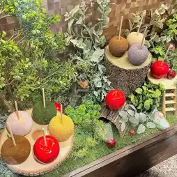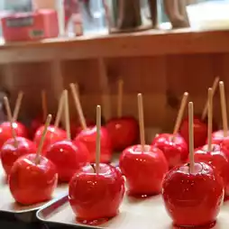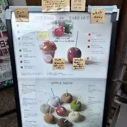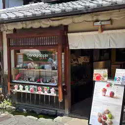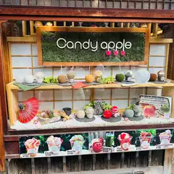 A sweet shop that features various types of candied apples. It is located in the Sannenzaka shopping street in front of Kiyomizu Temple, Kyoto Prefecture, Japan. The shop is decorated in a Japanese style. In front of the shop, there is a display case of various flavors of Apple models. There is a menu for eating at the shop or taking it home. Recommended menus are candied apples, apples sprinkled with green tea powder, apples sprinkled with cinnamon powder, apples sprinkled with kinako powder