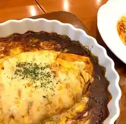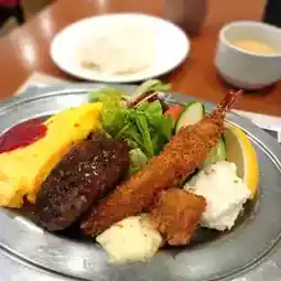 "A lunch" is a set meal consisting of a hamburger and seafood, with side dishes of omelette and lettuce salad, and comes with a plate of rice and thick soup. It costs ¥1529 yen. It tasted just as you imagined, the gravy flowed out when you cut the hamburger meat, it was of very high quality. The "Baked Omelet Rice" is made of cheese and European-style curry. The omelet melts in your mouth and slides down your throat easily. This is only 1,012 yen. No wonder it is still a favorite of Kyoto people after a century of operation. If you pass by Shinkyogoku Shopping Street, you may want to stop by and try it.