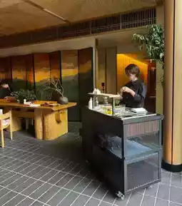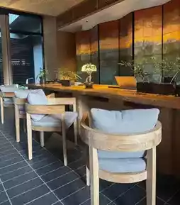 The building's exterior is calm yet dynamic. Natural stone and warm wood complement each other, revealing a rustic beauty that only grows with time. Step through the door and you'll be greeted by centuries-old craftsmanship. The intricate weaving of Nishimura Shoten and the colorful ceramics of Yoshimura Rakunyu are as beautiful as Mt. Kurama in the early morning light, their colors shifting with the changing light.