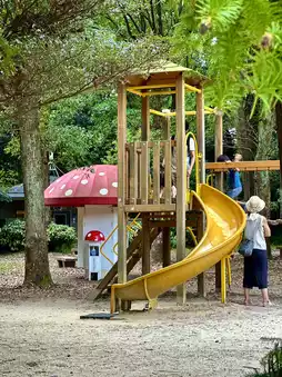 With a variety of play equipment, including slides and climbing structures, the playground ensures kids are entertained while parents take in the natural beauty of the garden.