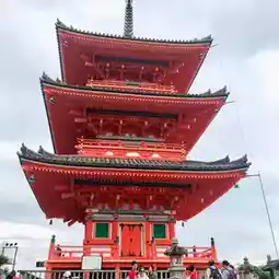 The Kiyomizu Three-Storied Pagoda is one of the iconic buildings of Kiyomizu Temple. It was rebuilt in 1633. The tower is decorated with red paint and stands among the green mountains.