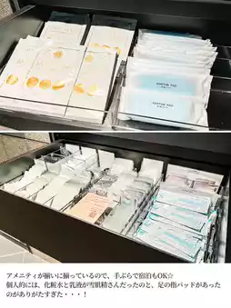 𓇼 Amenities included Sekkisei lotion and milk, as well as face masks and toe pads, so you're in for a treat.