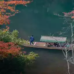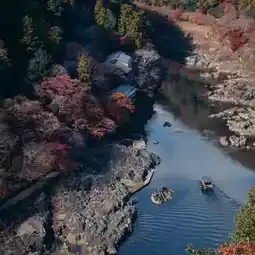 Walking down the stone steps along the riverbank to the riverside path, the perspective suddenly changes. Watching the shallow clear water of the Katsura River gently flow past the cormorant fishing boats, with boatmen dressed in traditional attire, holding long poles, slowly gliding across the river, creates a moving ukiyo-e painting. Switching to a standard lens at this time can better capture the boatmen's focused expressions and the intertwined details of the red leaves.
