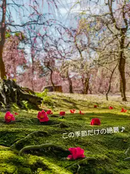 The moss mountain area is particularly worth seeing, and the scenery of "fallen camellias" that fall with their flowers on a beautiful carpet of moss, combined with the drooping plum blossoms, is truly a spectacular sight! 😄