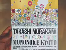 At the entrance, a large poster of Takashi Murakami stood tall, brightly colored, and the characters' big eyes looked back as if they were alive. The name 展覧会 (Tenrankai) "MONONOKE KYOTO" in Japanese characters reflected the sunlight, giving a sense of wonder even before stepping inside.