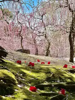 The pink and white weeping plums and the crimson camellias that have fallen onto the green moss are breathtakingly beautiful ~ʚ♡ɞ