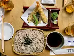 The restaurant itself is an old wooden house with a simple texture and antique charm. After passing through the beautiful garden, we arrived at the quiet dining area. The environment was quite comfortable. We ordered the overnight dried mackerel, fried shrimp tempura soba cold noodles, etc. The noodles were chewy and delicious, with a strong tea aroma. The overall performance was good.