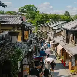 An old town in Kyoto with a stone-paved ramp connecting to Kiyomizu-dera Temple. There are souvenir shops, ryokan-style homstays, and various handmade products on both sides of the road.