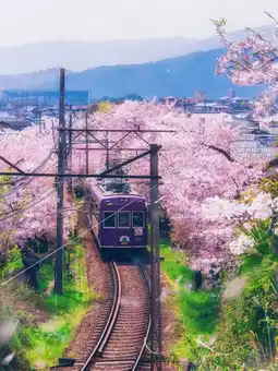 Spring in Kyoto is pure magic—where even train tracks burst with cherry blossoms 🌸.