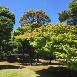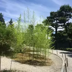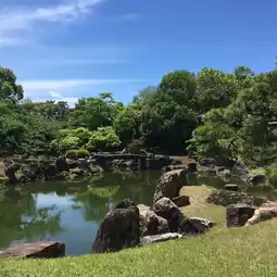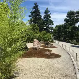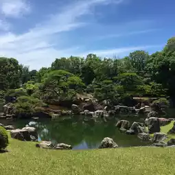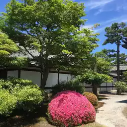 The garden's trees and flowers are meticulously pruned, with some trees resembling large bonsai, showcasing the dedication to Japanese landscaping art.