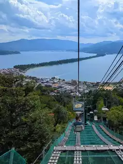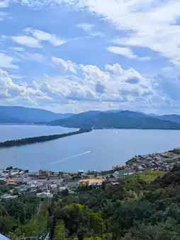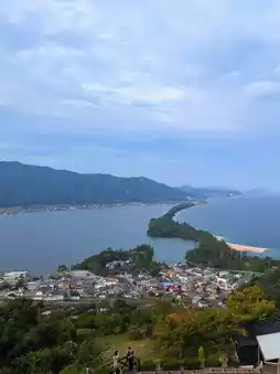One of Japan's Three Scenic Views! A 3.6km sandbar spans Miyazu Bay, legendary site where "gods built a bridge to heaven." From Kasamatsu Park observatory, the sandbar looks like a soaring dragon!