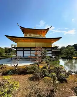 Ashikaga Yoshimitsu's golden residence! Three-story pavilion covered in gold leaf, reflecting in Mirror Pond through four seasons: spring cherry blossoms with golden edges, winter snow on glazed tiles.